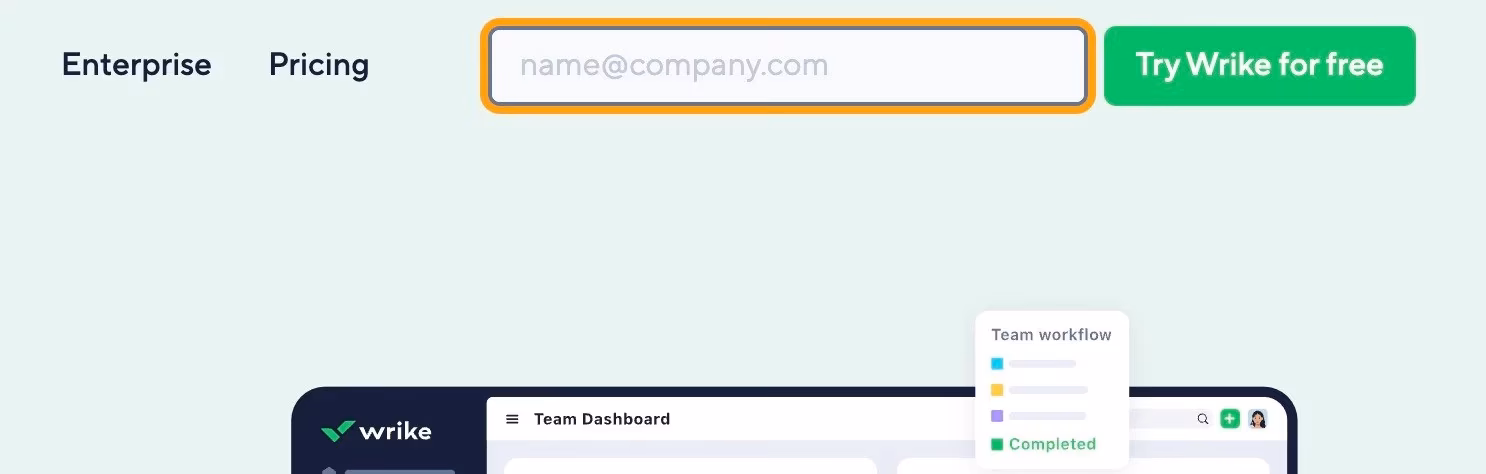 Here’s an extremely good example from Wrike. On their website, clicking the “Try Wrike for free” button pops up with an email input – without even redirecting people to a Sign Up page.
