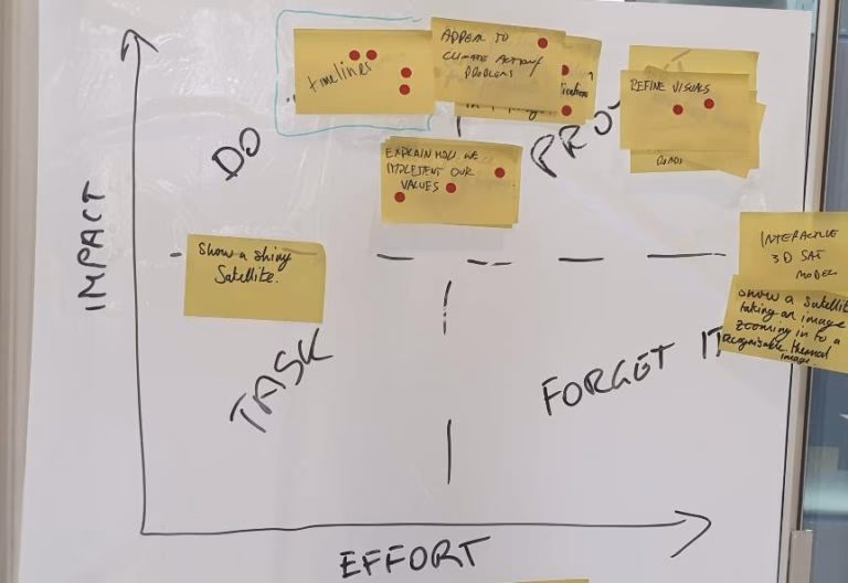 Then ask about the effort in the same fashion. The team can ask the facilitator to go “left” or “right”, and then they stick it in the final spot. Repeat that for all of the ideas that made it into your priority tree.