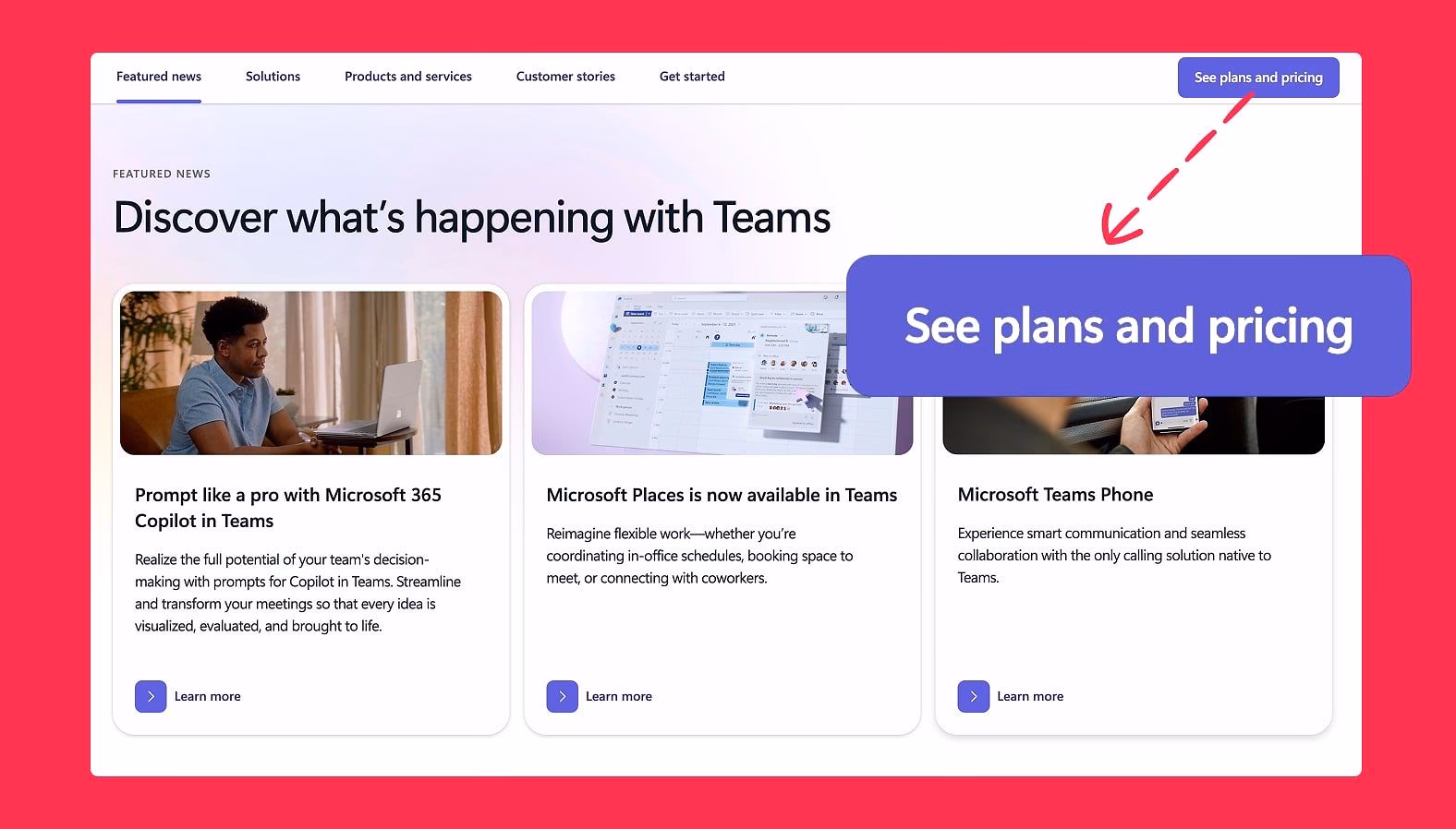 To back up the claim that primary CTA isn’t always transactional, here’s an example of Microsoft Teams using a transitional CTA as their primary one: