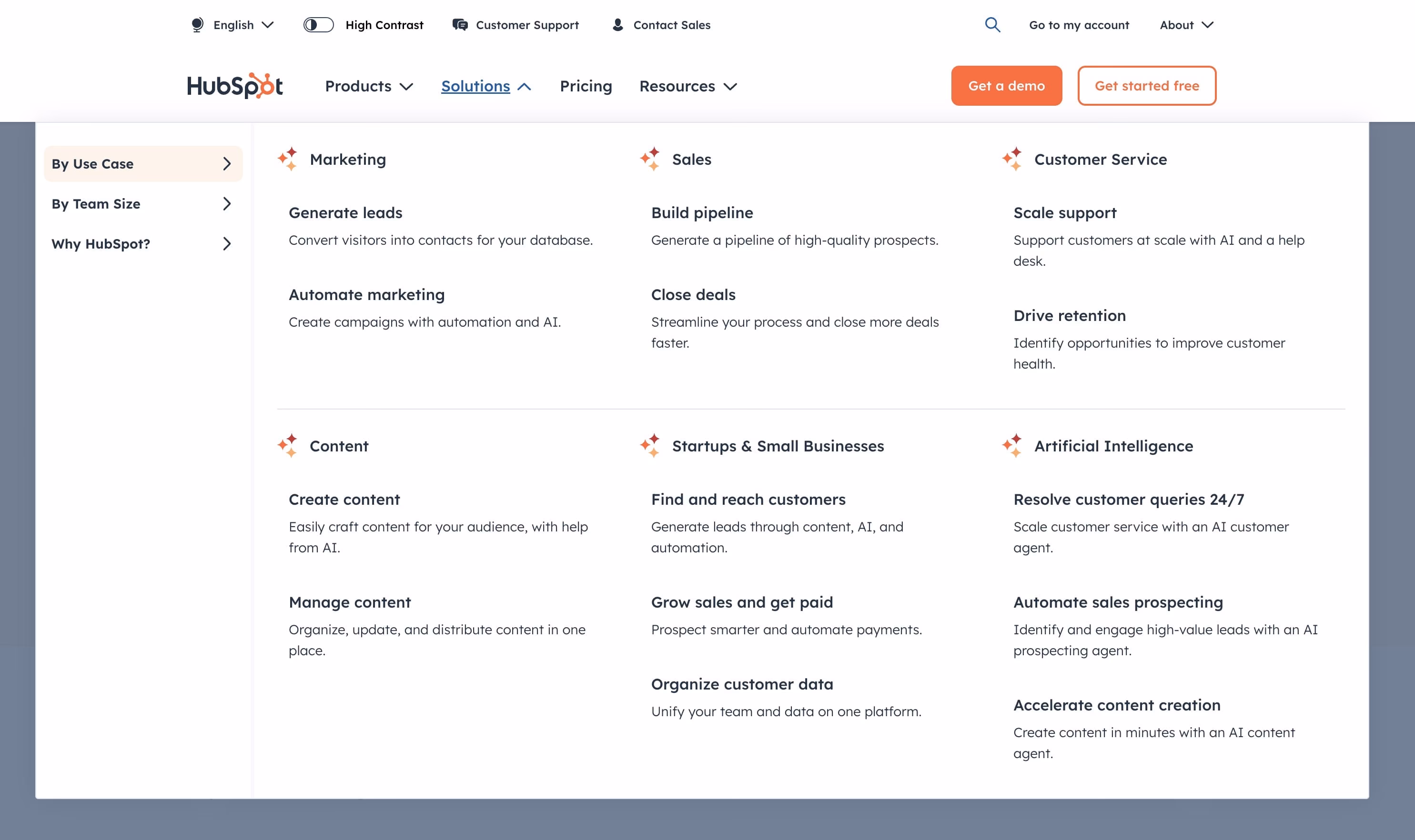 The first example comes from HubSpot. They segment by the combination of function+requirements (#4 on our list), with secondary segmentation by team size (#5).
