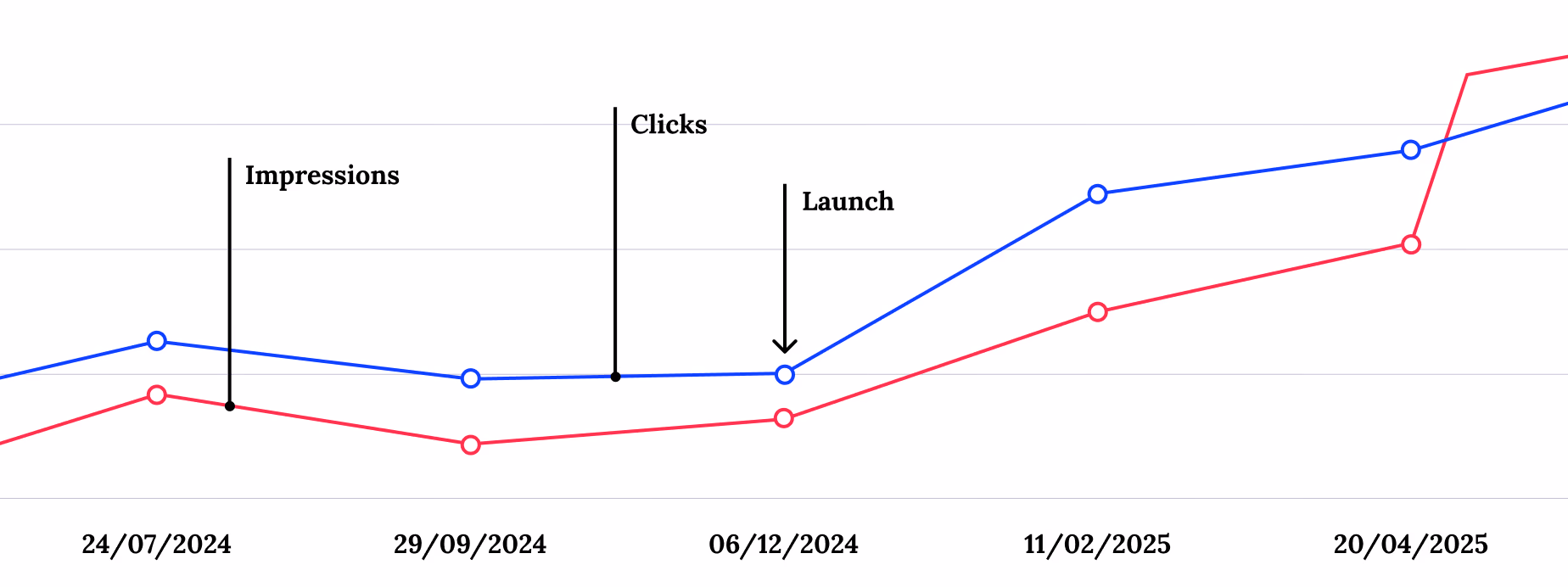 Even though we specialise in converting traffic brought to the site by marketing teams, we’re constantly helping the content and SEO team with technical improvements. Their efforts resulted in a 3.5x increase in impressions and 1.75x more clicks YoY.